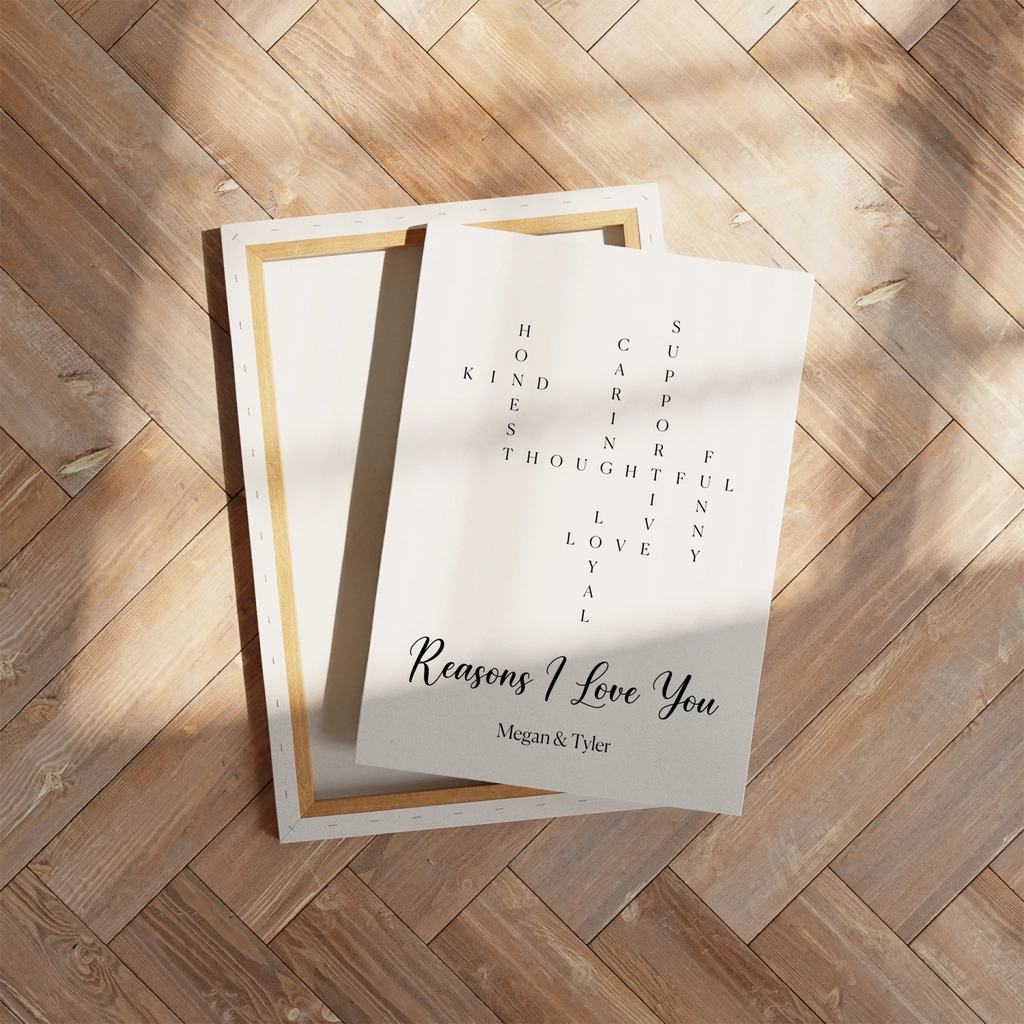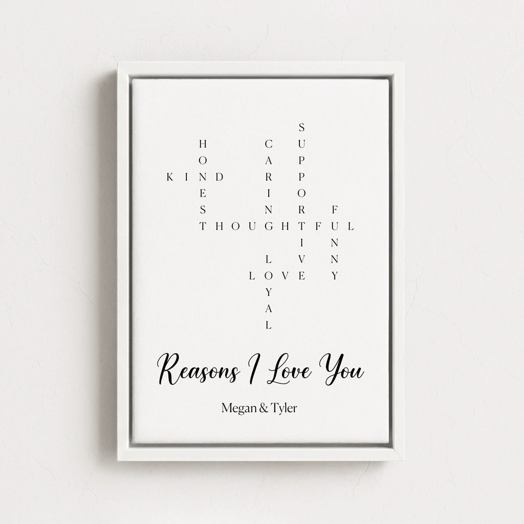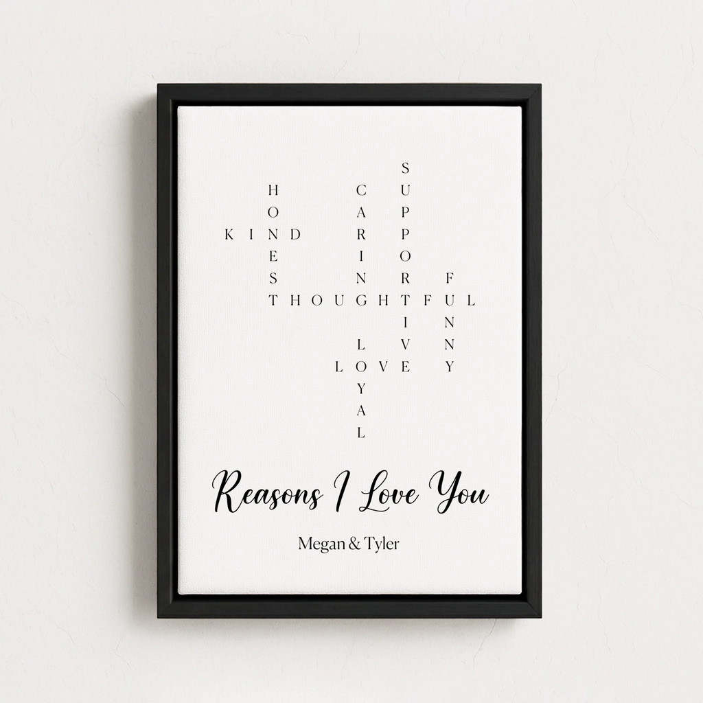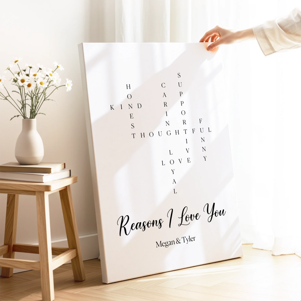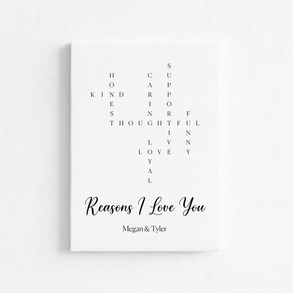 Everything I love about you, captured in a crossword design on canvas or poster. Truly personal, perfect for Valentine's Day.