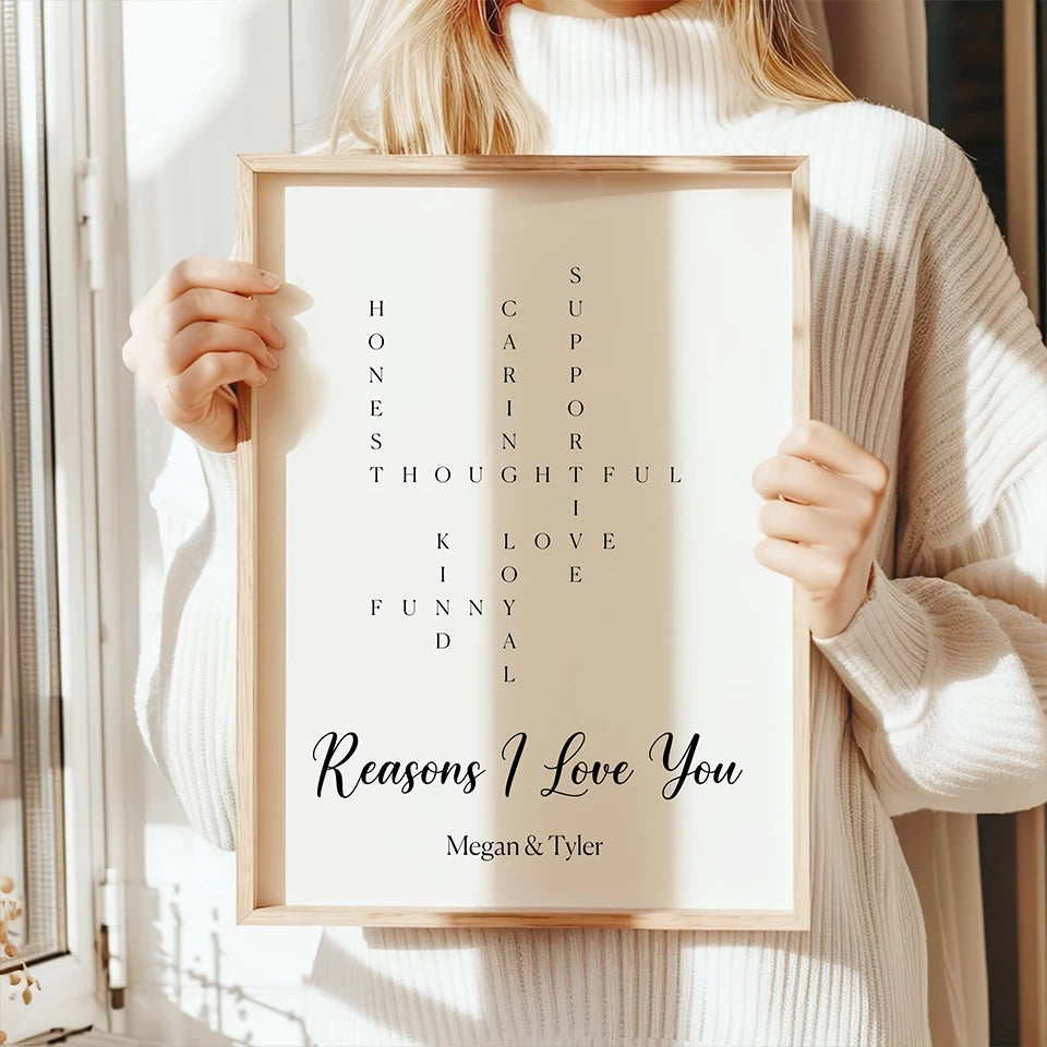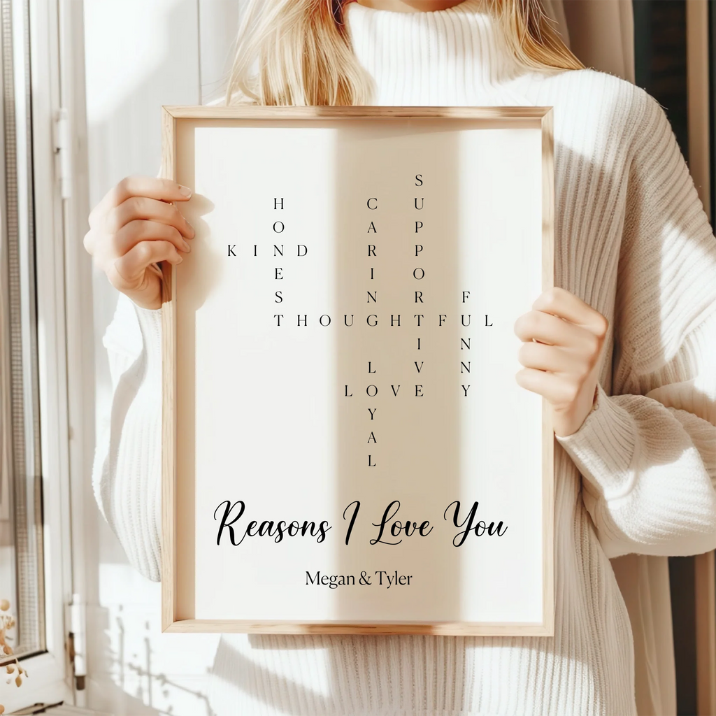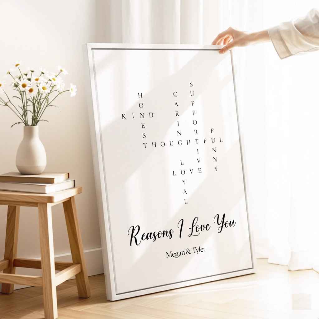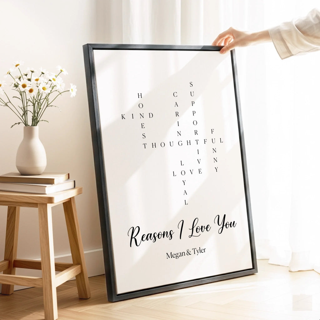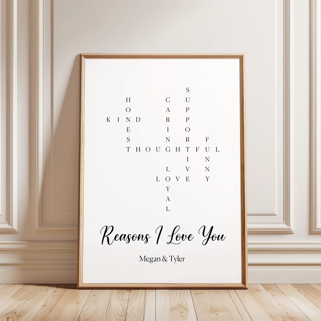 Everything I love about you, captured in a crossword design on canvas or poster. Truly personal, perfect for Valentine's Day.